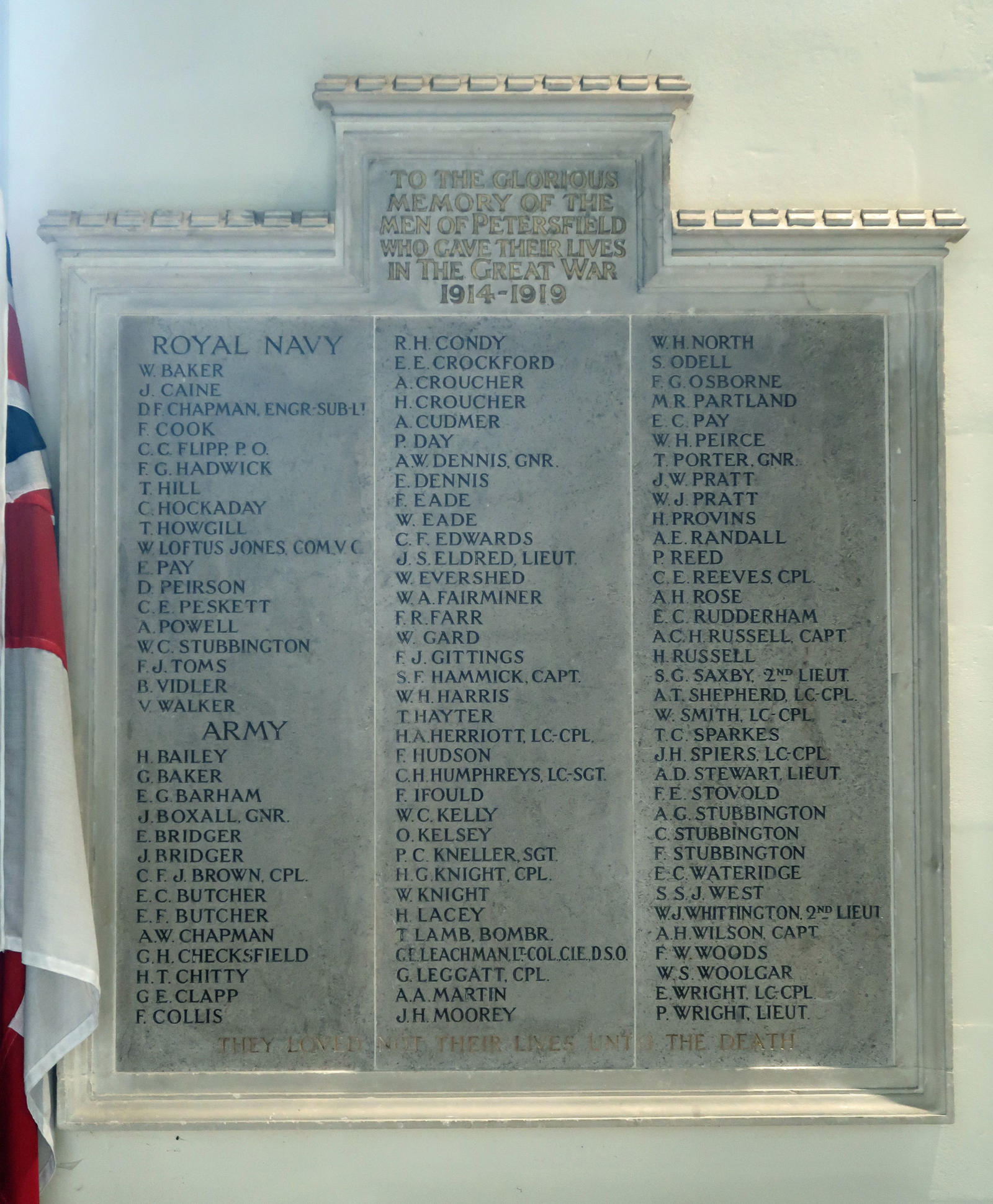To the glorious memory of the men of Petersfield who gave their lives in the Great War, 1914-1918. They loved not their lives unto the death. Includes: J Caine; T Hill; T Howgill, A Powell,